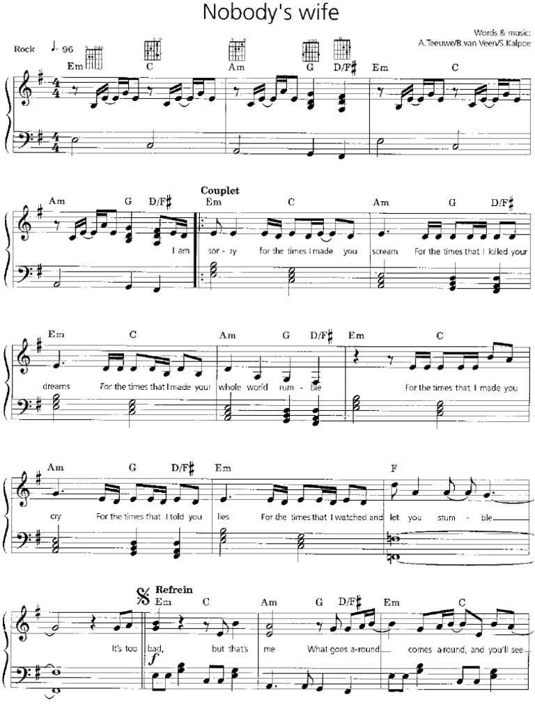 Download and print in pdf or midi free sheet music for nobodys wife by anouk arranged by torana for drum group (solo). Music video by anouk performing nobody's wife (dutch version).#anouk #nobodyswife #vevo. The song was released as the second single from dutch singer's debut album together alone (1987). I'm sorry for the times that i made you scream for the times that i killed your dreams for the times that i made your whole world rumble fo. I'm sorry for the times that i made you scream for the times that i killed your dreams for the tim.